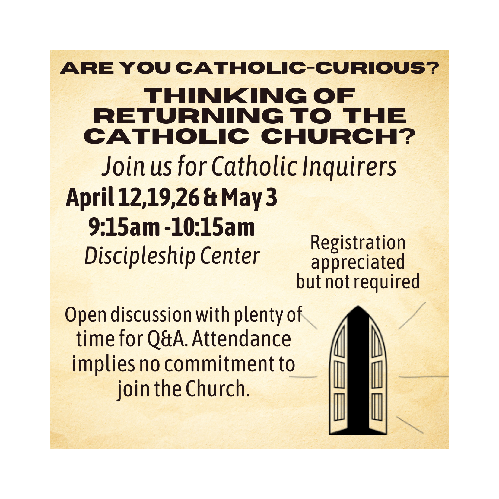 If you want to know more about the Catholic Church, Inquiry will be offered in the summer and normally consists of 3 classes of 1-2 hours each. There is no cost and attending implies no commitment on your part to join the Catholic Church. All are simply invited to learn the truth about the Catholic faith. These gatherings are open to adults (15+) who are not baptized, as well as to those who are baptized Christians from other faith backgrounds. Practicing Catholics who are bringing inquirers are also welcome.